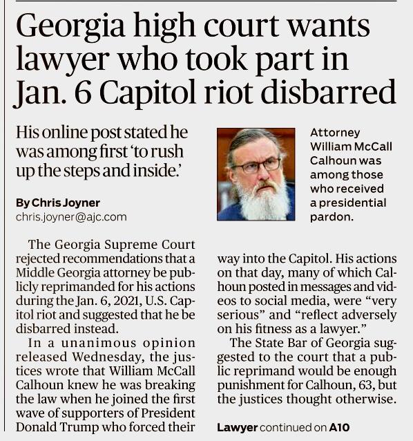January 23 - I agree with the Georgia Supreme Court that a lawyer convicted of a crime based on his participation in the January 6th attack on the US Capitol should be disbarred. The State Bar thinks a reprimand is sufficient. Please read this AJC article and tell me what you think.