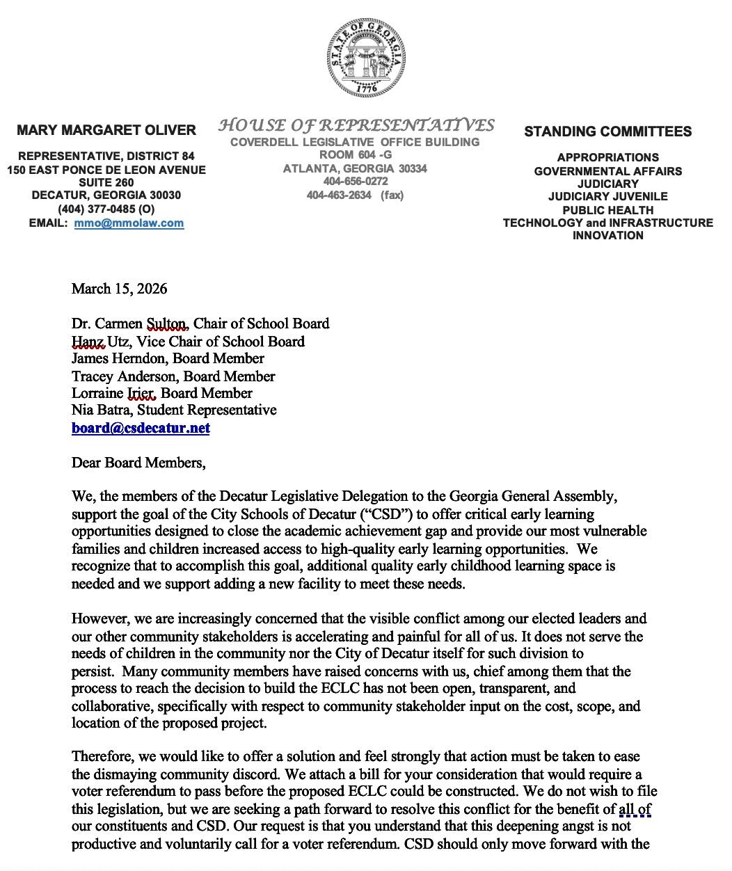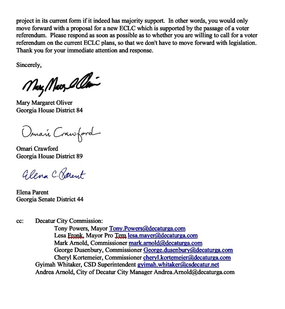 Yesterday, the Decatur legislative delegation sent a letter to the members of the CSD Board of Education asking them to request a voter referendum on the ECLC project. Decaturish has already written an article on the letter, and you may read that article in its entirety HERE. Please see the below letter.