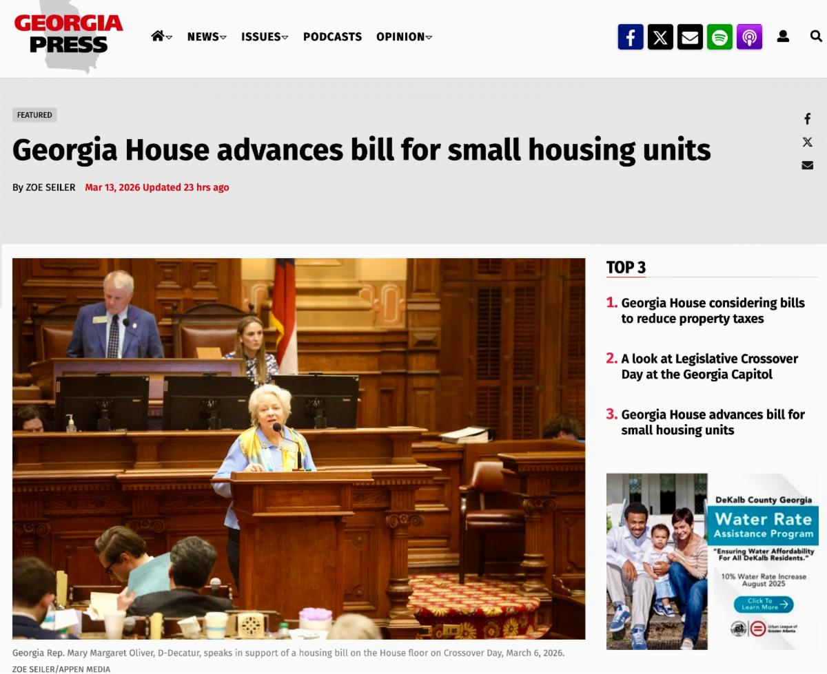 Thanks to the Georgia Press for covering HB 1166, one of the bills in the House Dems' housing affordability package. “Whether you’re a small, medium or large county, we know we need more housing options,” Oliver said. “A group of us have been working on housing options, tenant rights enhancements and other incentives to create more doors, more opportunities for housing options that could be more affordable, like small houses less than 400 square feet..." Rep. Mary Margaret Oliver, D-Decatur, said counties across the state are grappling with housing affordability and housing supply." Read the entire article HERE.