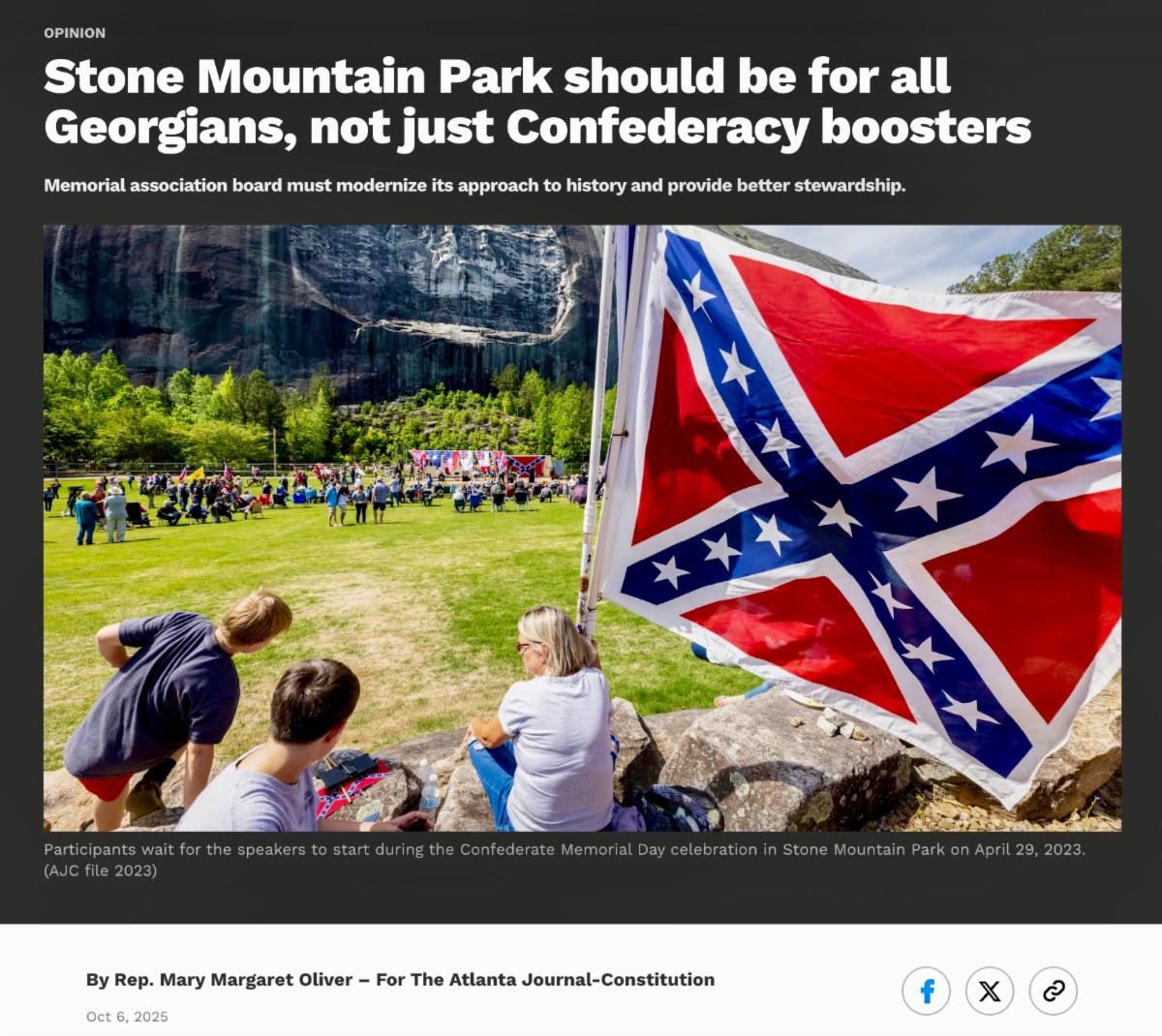 Thank you AJC for publishing my column! I wrote this opinion piece in hopes that the Republican leadership would allow a hearing on our legislative efforts to move the Stone Mountain Memorial Association Board forward to a more modern and business friendly face and message. The article begins: "A DeKalb County lawmaker wants to make Stone Mountain Park inclusive for all Peach State residents, not just those who honor the Confederate States of America's history. " What would you advise?