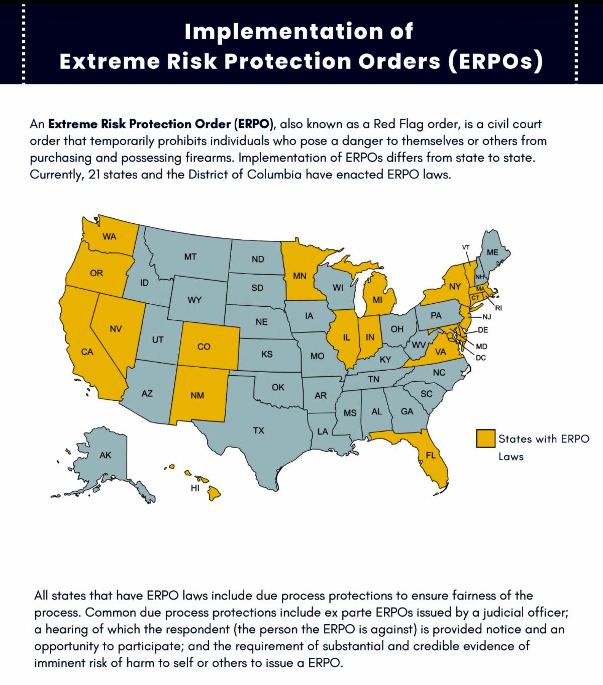 22 states, the District of Columbia and the U.S. Virgin Islands have passed red flag laws, or Extreme Risk Protection Orders (ERPOs). The University of Michigan's data on red flag laws by state is very helpful in understanding the similarities between different ordinances: https://firearminjury.umich.edu/erpo-by-state/