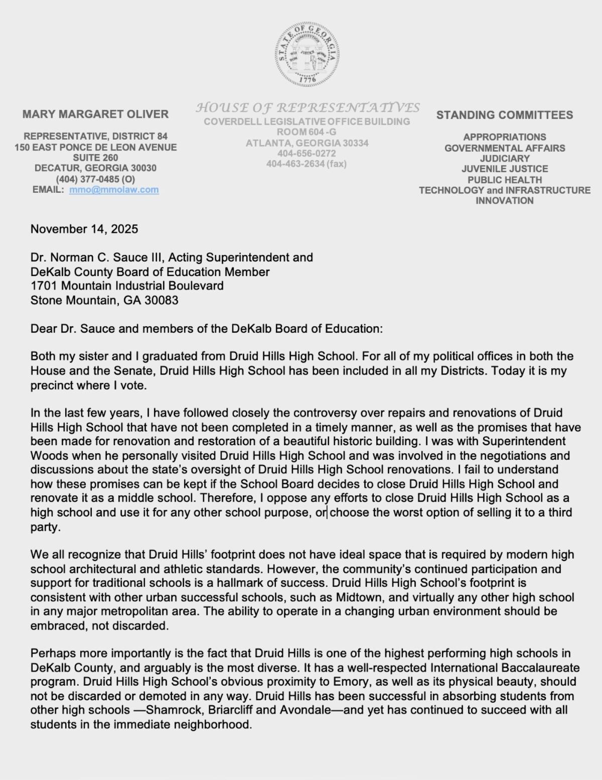 As we were "going to print" this morning, we got good news that the DeKalb County School Board does not intend to close or move Druid Hills High School. I’m very grateful. I hope this news continues to be true, but I want the Board and my constituents to know my view in the following letter.