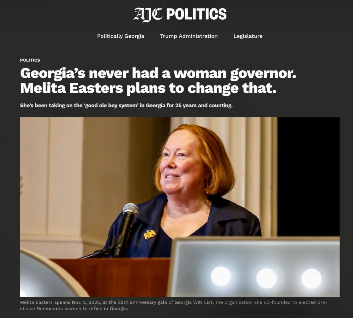 I am delighted my friend Melita Easters and Georgia WIN List have gotten well deserved recognition this morning from AJC columnist Patricia Murphy. Georgia WIN List is good news for all of us! https://www.ajc.com/politics/2025/11/georgias-never-had-a-woman-governor-melita-easters-plans-to-change-that/