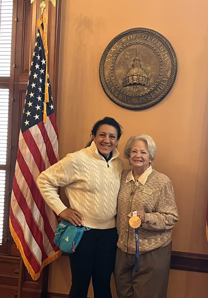 March 23 - Great way to start a Monday at the Capitol! Holding Elana Meyers Taylor’s gold medal! And, her father was an Atlanta Falcon—- so cool!